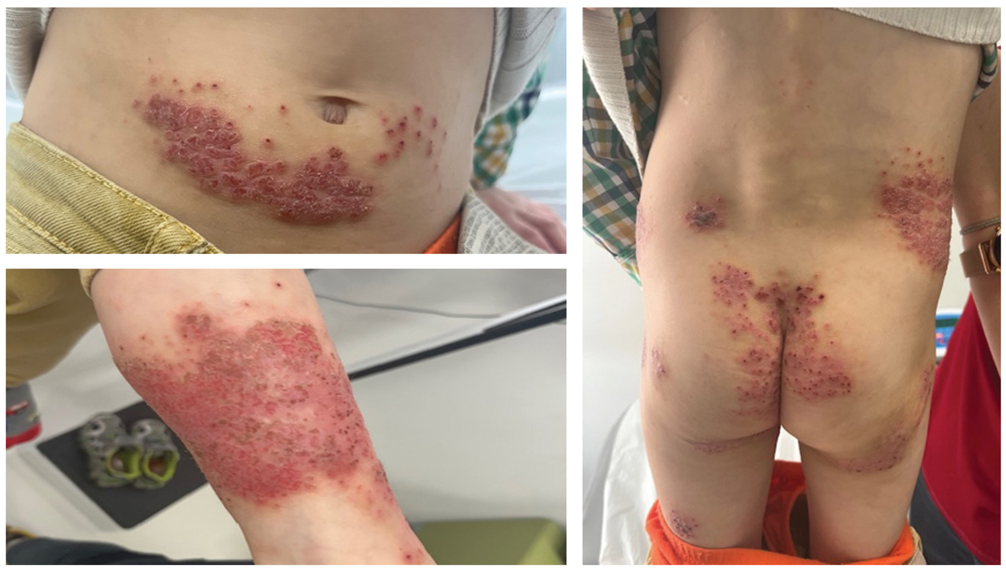 Ωστόσο ο ασθενής παρουσίασε επιδεινούμενη ατοπική δερματίτιδα κατά τη διάρκεια των 2 τελευταίων ετών με συνεχείς εξάρσεις, παρά τη λήψη τόσο τοπικής όσο και συστηματικής αγωγής. Συγκεκριμένα, κατά την επίσκεψη του παρουσίαζε βλάβες με κατανομή σε κορμό, ραχιαία και έξω επιφάνεια κνήμης, καμπτική επιφάνεια άνω άκρων και καρπούς. Οι βλάβες είχαν τη μορφή εφελκιδοποιημένων, συρρεουσών βλατίδων και ήταν έκζεματοπoιημένες – λειχηνοποιημένες κατά τόπους. Στον ασθενή παρατηρήθηκαν επίσης περιοφθαλμική υπερμελάγχρωση και χειλίτιδα. Το δέρμα του παρουσίαζε έντονη ξηρότητα. Το εξάνθημα ήταν έντονα κνησμώδες, με αποτέλεσμα σημαντική έκπτωση ποιότητας ζωής, τόσο του ιδίου όσο και της οικογένειας του