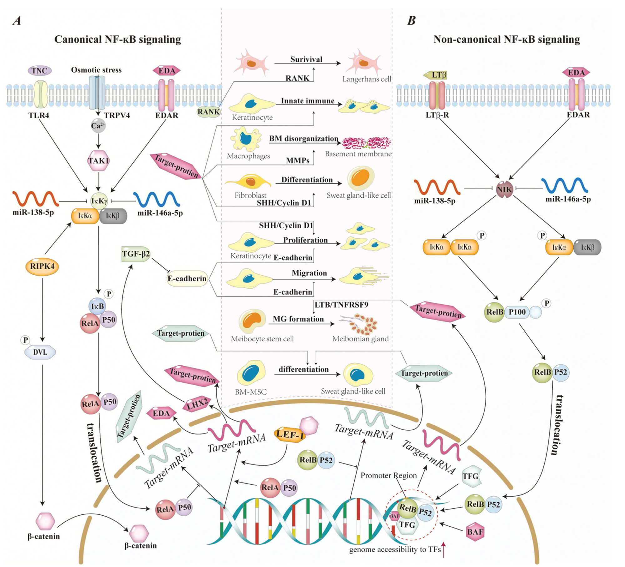 Εικόνα 2: A. Ρόλος του canonical NF-κB μονοπατιού στην ανάπτυξη του δέρματος και των εξαρτημάτων του. B. Ρόλος του non-canonical NF-κB μονοπατιού στην ανάπτυξη του δέρματος και των εξαρτημάτων του.